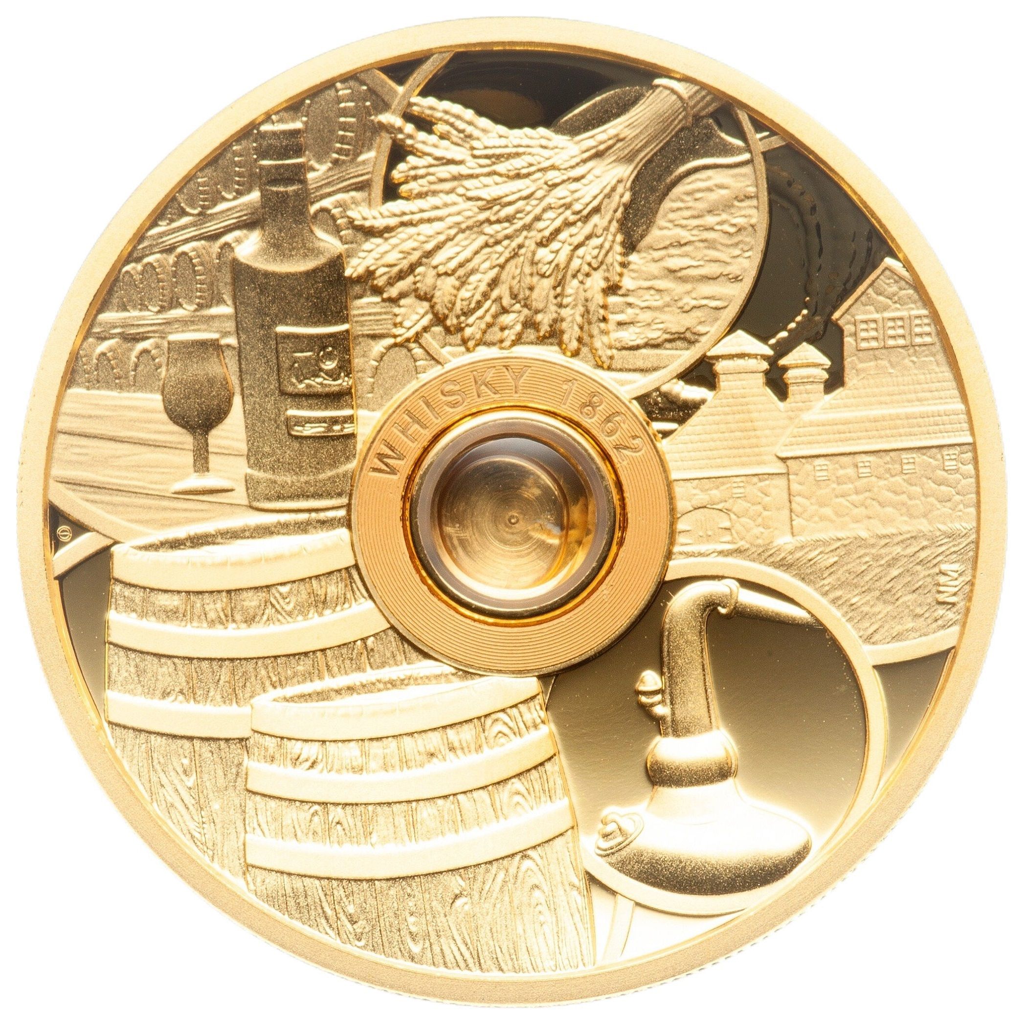 Опис: Зображення традиційного процесу дистиляції: бочки з віскі; пляшка та склянка віскі; снопи зерна (ймовірно, ячменю, основного інгредієнта віскі); будівля винокурні та дистиляційний казан, які використовуються в процесі дистиляції. Центральна капсула містить краплю віскі.