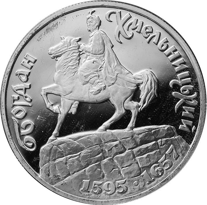 Опис: У центрі монети зображено фотографію пам'ятника Богдану Хмельницькому на Софійській площі в Києві. По колу монети зліва розміщено напис БОГДАН, справа — ХМЕЛЬНИЦЬКИЙ, а на тлі постаменту — 1595-1657.