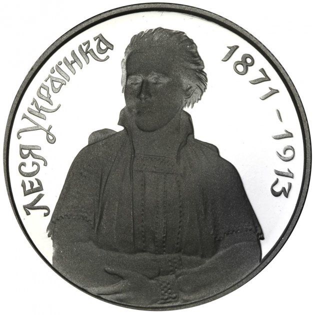 Опис: На монеті зображено портрет Лесі Українки. По периметру монети розміщено написи: ЛЕСЯ УКРАЇНКА — ліворуч та 1871-1913 — роки народження та смерті поетеси — праворуч.