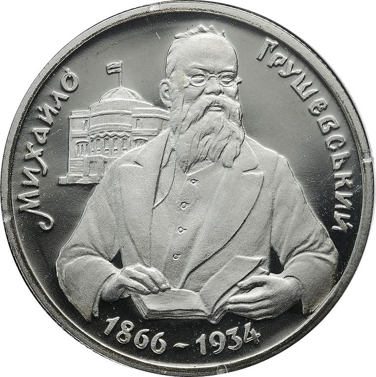 Опис: У центрі зображено портрет М. Грушевського, ліворуч на тлі — будинок Центральної Ради (нині Клуб вчителів), де працював перший президент Української Народної Республіки в 1917-1918 роках. По колу монети розміщені написи: МИХАЙЛО — ліворуч, ГРУШЕВСЬКИЙ — праворуч, а також 1866-1934 — роки народження та смерті Грушевського.