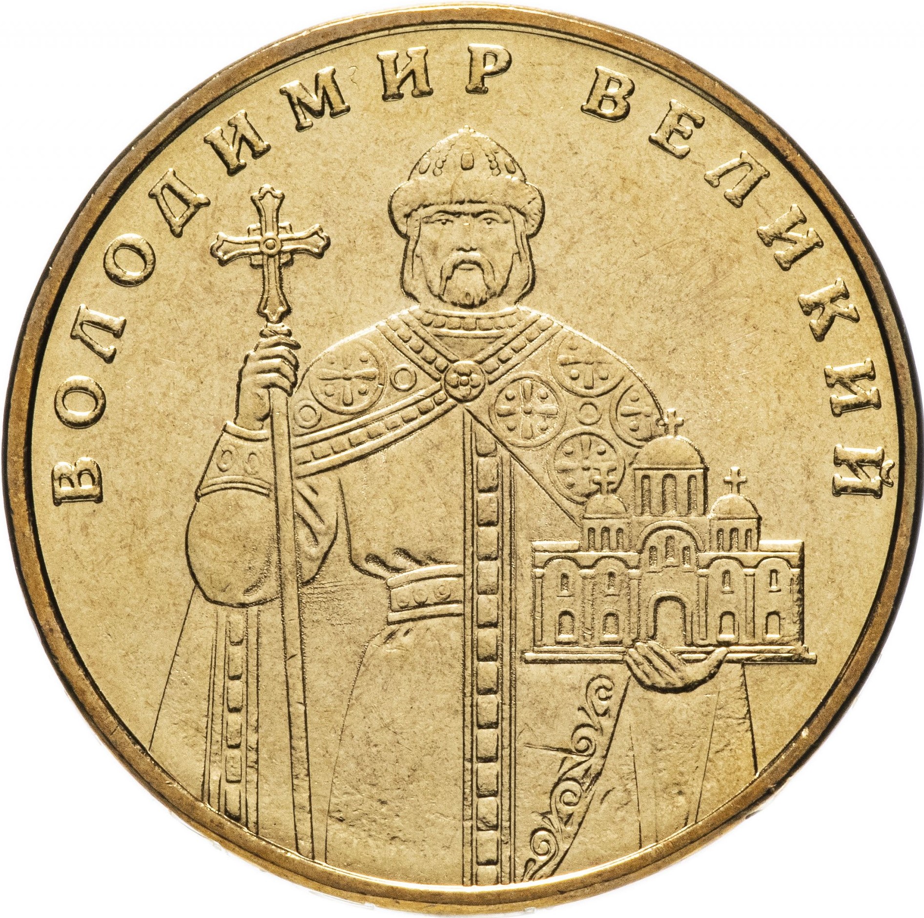 Опис: Напівфігура Володимира Великого в анфас, який тримає модель церкви та посох, з легендою зверху.