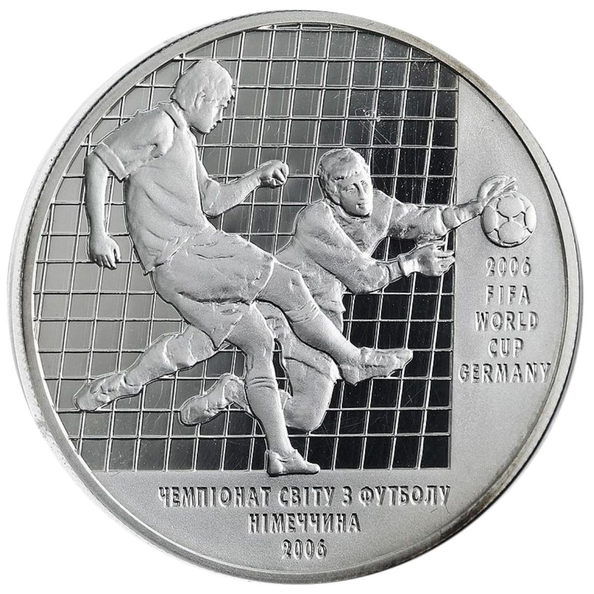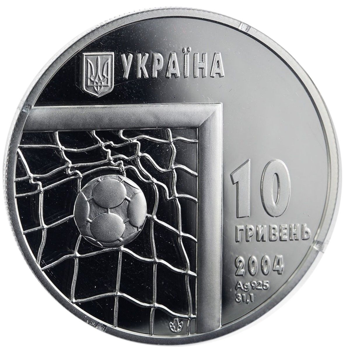 Опис: На монеті вигравірувано м'яч у воротах; над ним — малий Державний герб України та напис: УКРАЇНА (Україна); праворуч від воріт є написи: на срібній монеті: 10/ ГРИВЕНЬ/ 2004 (10 /Гривня / 2004), а також позначення металу, його проби та ваги в пробі. Крім того, є логотип Монетного двору Національного банку України.