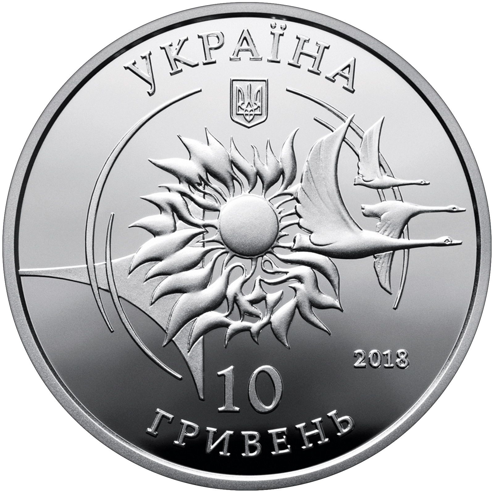 Опис: Зверху розміщено напис «УКРАЇНА», під яким зображено малий герб України; у центрі — стилізована композиція, що складається із сонця, стилізованого крила та трьох птахів; нижче вказано номінал монет: 10/ГРИВЕНЬ (10/гривень) та рік випуску — 2018 (праворуч).