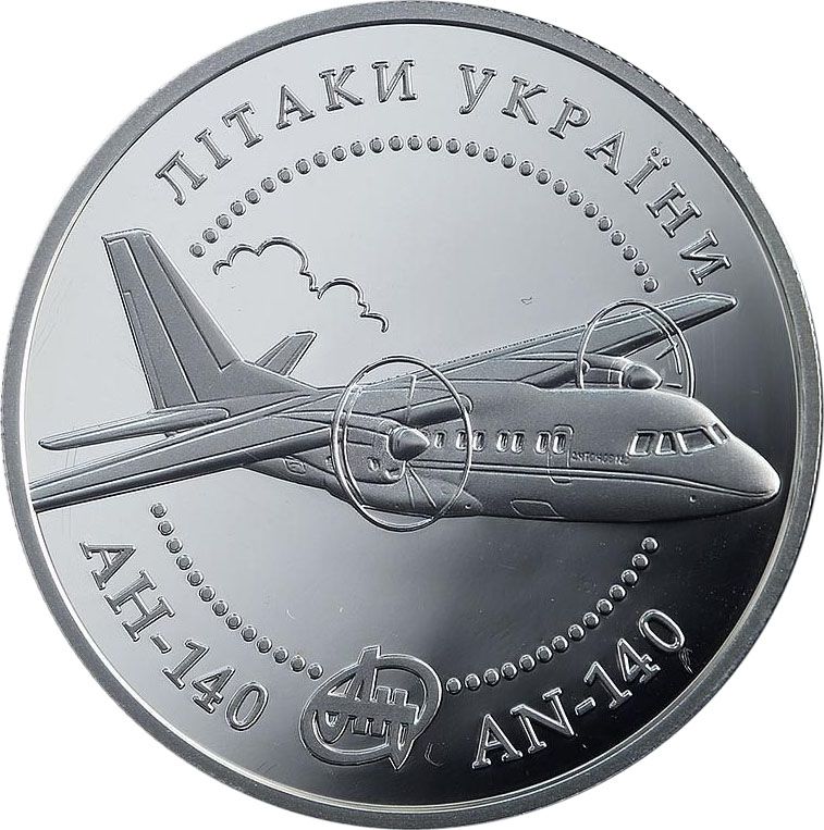 Опис: На монеті зображено літак АН-140, а між зовнішнім краєм монети та кругом з бусинками розміщено кругові написи: ЛІТАКИ УКРАЇНИ (літаки України) — зверху, АН-140 та AN-140 — знизу; між ними зображено логотип AN.