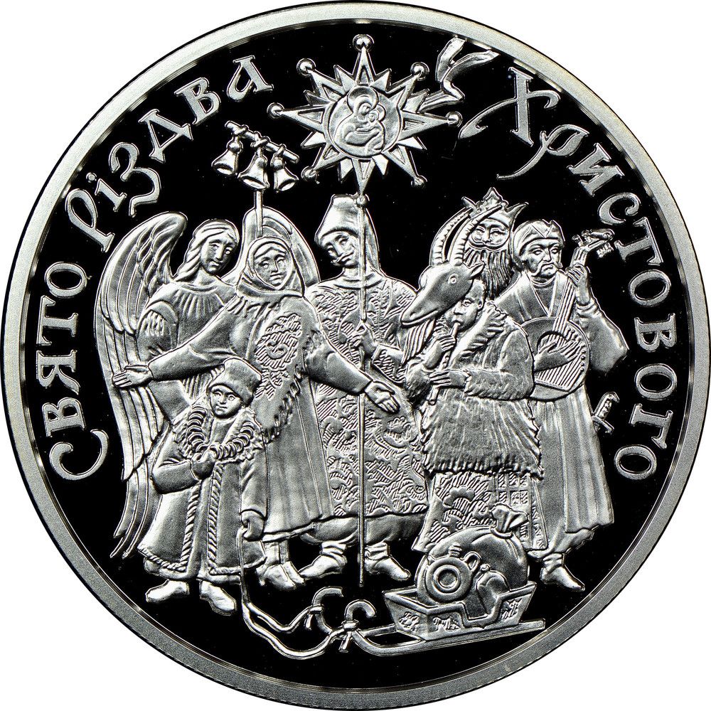 Опис: На монеті зображено традиційну святкову сцену: група людей співає різдвяну колядку, а над ними зображено різдвяну зірку з написом СВЯТО РІЗДВА ХРИСТОВОГО (Святкування Різдва).