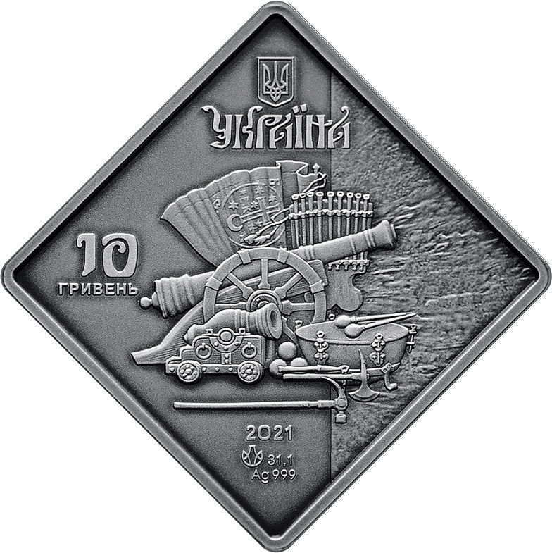 Опис: Зверху зображено малий герб України, під яким розміщено напис УКРАЇНА; зліва — номінал 10/ГРИВЕНЬ (10/гривень); нижче — рік випуску монети, вага монети та метал і його проба — 2021/31,1/Ag 999, а також знак монетного двору Друкарно-монетного двору НБУ; у центрі монети — такі композиції: Козацькі регалії та інші артефакти, що символізують періоди козацької доби, збагачують історичний фон і відтворюють загальну атмосферу тієї епохи.