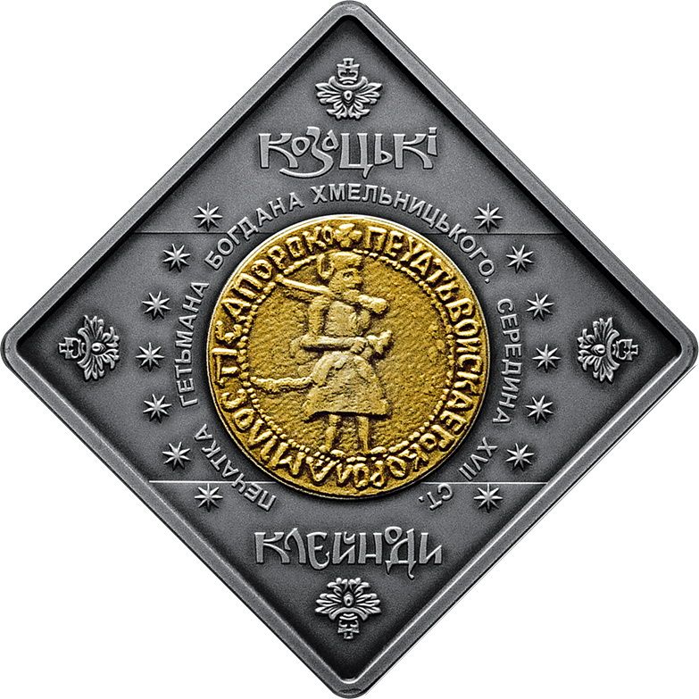 Опис: Є гетьманські печатки (декоративний елемент — місцеве позолочення) — одна з важливих козацьких регалій гетьмана Івана Скоропадського. Є такі легенди: КОЗАЦЬКІ (козацькі) (зверху) та КЛЕЙНОДИ (регалії) (знизу); ім'я власника печатки знаходиться навколо печатки.