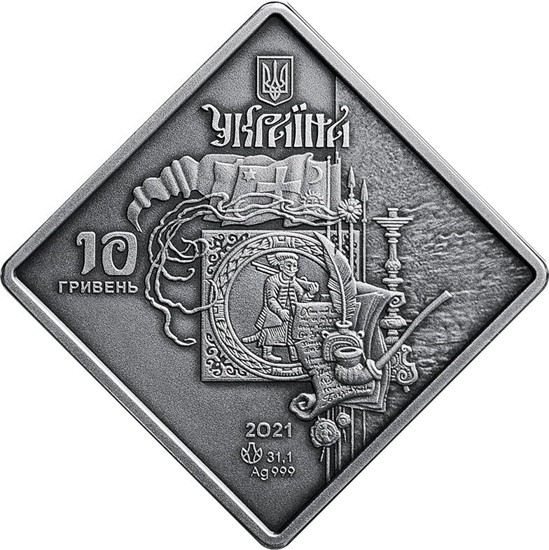 Опис: Зверху зображено малий герб України, під яким розміщено напис УКРАЇНА; зліва — номінал 10/ГРИВЕНЬ (10/гривень); нижче — рік випуску монети, вага монети та метал і його проба — 2021/31,1/Ag 999, а також знак монетного двору Дrukárня банкнот та монетного двору НБУ; у центрі монети — такі композиції: Козацькі регалії та інші артефакти, що символізують періоди козацької доби, збагачують історичний фон і відтворюють загальну атмосферу тієї епохи.