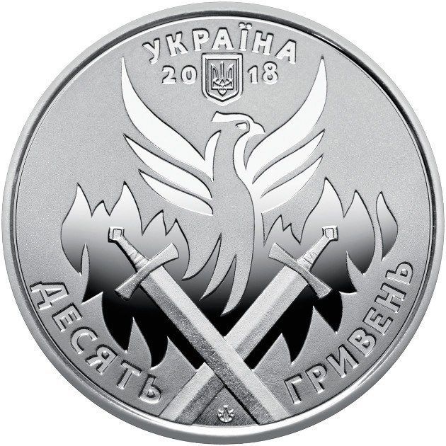 Опис: Зверху, на рельєфному тлі, розміщено напис «УКРАЇНА», під яким зображено малий герб України; ліворуч і праворуч від герба — цифри, що складають рік випуску монети — 2018; у центрі – стилізована композиція, що зображає схрещені мечі з феніксом над ними, що символізує відродження; нижче – знак монетного двору ДП «Банкнотно-монетний двір НБУ» та номінал монети ДЕСЯТЬ ГРИВЕНЬ (півкруглий).