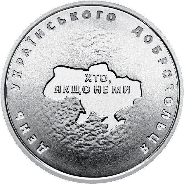Опис: На рельєфному тлі зображено карту України з написом ХТО, ЯКЩО НЕ МИ (якщо не ми, то хто); навколо є наступний круговий напис: ДЕНЬ УКРАЇНСЬКОГО ДОБРОВОЛЬЦЯ (День українського добровольця).