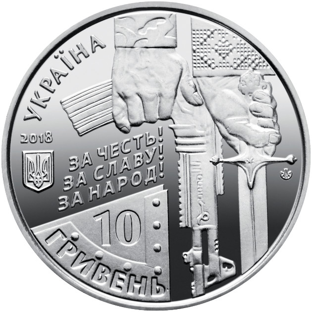 Опис: Зверху ліворуч — напівкругла легенда «УКРАЇНА», під якою розміщено рік випуску монети (2018) та малий герб України; у центрі — стилізована композиція: дві чоловічі руки, що тримають зброю різних епох, які символізують захисників України з різних історичних періодів; на гладкому тлі розміщено легенди: «ЗА ЧЕСТЬ! ЗА СЛАВУ! ЗА НАРОД! (За честь! За славу! За народ!); внизу ліворуч на тлі стилізованого фрагмента щита – номінал монети 10/ГРИВЕНЬ (10/гривень); праворуч – знак монетного двору – Монетний двір НБУ.