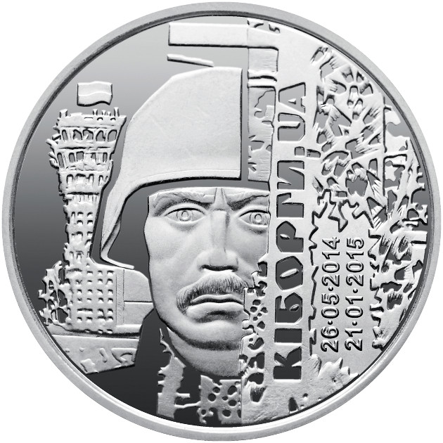 Опис: На монеті зображено захисника аеропорту на тлі напівзруйнованої диспетчерської вежі, над якою майорить український прапор; праворуч — продірявлені кулями металеві конструкції з вертикальним написом: КІБОРГИ. UA/ 26•05•2014/21•01•2015 (CYBORGS. UA/ 26•05•2014/21•01•2015).