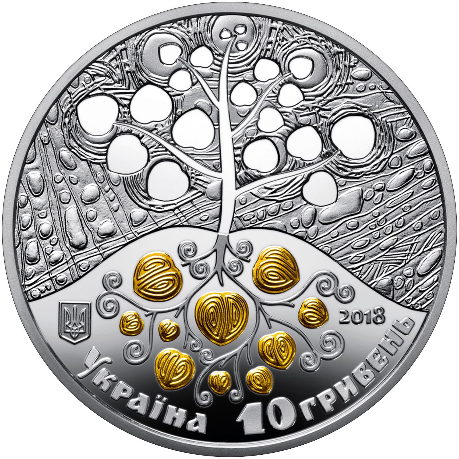 Опис: Є узагальнений образ дерева життя; верхівка дерева гладка і розміщена на тлі поля; нижні бульби золоті і розміщені на гладкому тлі. Нижче розташовані малий герб України (зліва), рік випуску монети 2018 (праворуч), напівкругла легенда УКРАЇНА (Україна) та номінал монети 10/ГРИВЕНЬ (10/гривень).