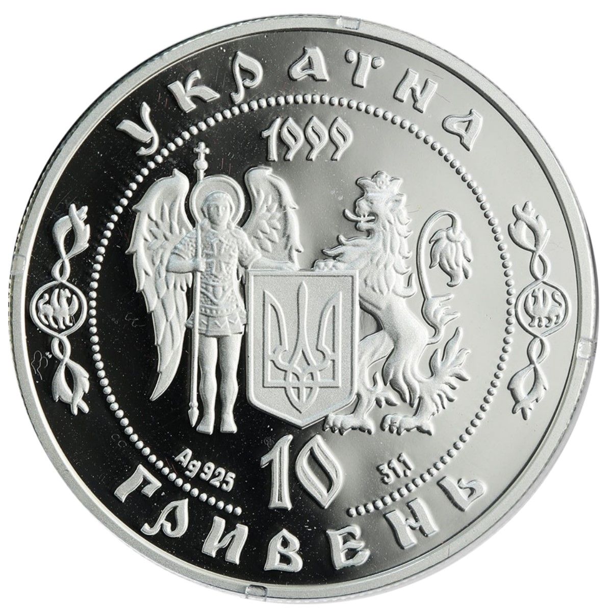 Опис: Є композиція, схожа на всю серію монет, яка втілює національну ідею єдиної України: поруч із маленьким Державним гербом України розташовані символічні фігури Михаїла Архістратега та коронованого лева, які є символами міст Києва та Львова. Кругові написи розділені бароковим орнаментом: УКРАЇНА, 10 ГРИВЕНЬ, 1999, позначення дорогоцінного металу - Ag 925 та його вага в пробі - 31,1.