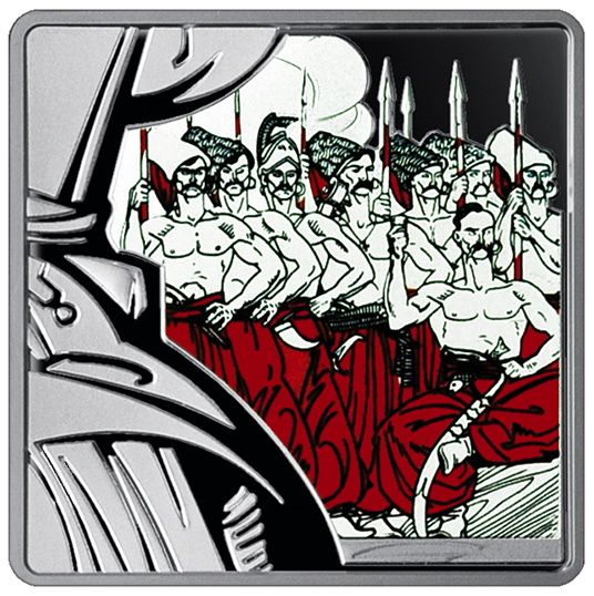 Опис: Зверху праворуч розташований малий герб України, під яким вертикально написано УКРАЇНА, номінал монети 10 (всередині нуля знак ₴), метал монети, її проба та вага Ag 999, 31,1, а також знак монетного двору НБУ (знизу); зліва – вертикальні написи, викладені у два рядки: 1926 ХУДОЖНИК/2005 АНАТОЛІЙ БАЗИЛЕВИЧ (1926 художник/2005 Анатолій Базилевич); зверху ліворуч – напис ЕНЕЇДА (Енеїда).