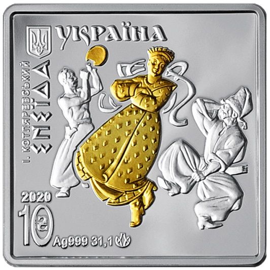 Опис: Зверху розміщено малий герб України та напис «УКРАЇНА»; знизу — рік випуску монети 2020, номінал монети 10 (всередині нуля розміщено знак ₴); металу монети, її проби та ваги Ag 999, 31,1, а також знак монетного двору ДЗПППБ НБУ. Також є такі вертикальні написи: І. КОТЛЯРЕВСЬКИЙ/ЕНЕЇДА (І. Котляревський/Енеїда).