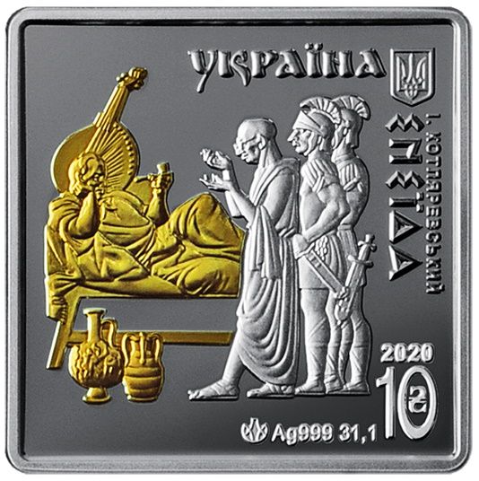 Опис: Зверху зображено малий герб України та напис «УКРАЇНА»; знизу — рік випуску монети 2020, номінал монети 10 (всередині нуля знаходиться знак ₴); металу монети, її проби та ваги Ag 999, 31,1, а також знак монетного двору ПБНБ «Друкарня банкнот і монетний двір». Також є такі вертикальні написи: І. КОТЛЯРЕВСЬКИЙ/ЕНЕЇДА (І. Котляревський/Енеїда).