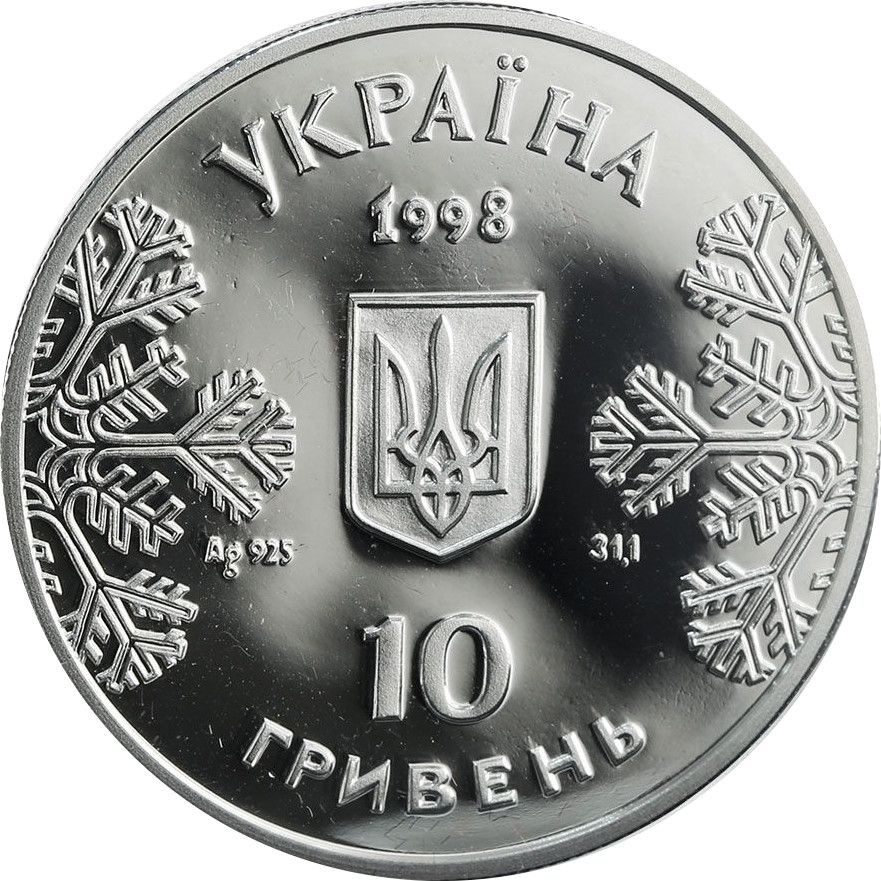 Опис: У центрі монети зображено невеликий Державний герб України; по боках — сніжинки та позначення Ag 925, символ дорогоцінного металу, і його вага 31,1. Над Державним гербом — рік випуску монети — 1998. По колу монети розміщено напис: УКРАЇНА та у два рядки — 10 ГРИВЕНЬ.