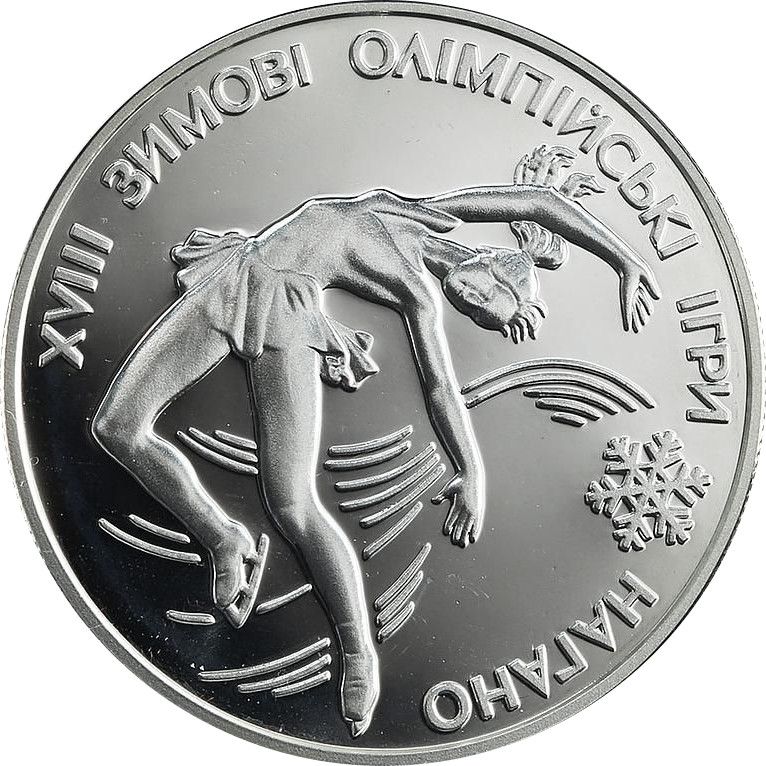 Опис: На монеті зображено фігуриста, який виконує стрибок на тлі декоративних ковзанок. По периметру монети розміщено напис: ХVІІІ ЗИМОВІ ОЛІМПІЙСЬКІ ІГРИ НАГАНО, розділений сніжинками.