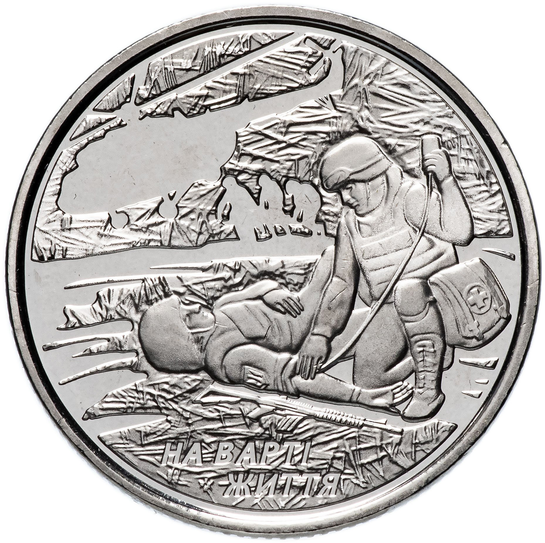 Опис: Зліва зображено малий герб України, зверху — напівкруглий напис «УКРАЇНА», праворуч — рік випуску монети «2019», а знизу — номінал монети «ДЕСЯТЬ ГРИВЕНЬ» (напівкруглий). у центрі – стилізована композиція: полум’я, всередині якого зображено хрест – символ медицини, оточений осколками, що нагадують камуфляжний матеріал і символізують трагедію війни; нижче, між двома осколками, – знак монетного двору – Монетний двір НБУ.
