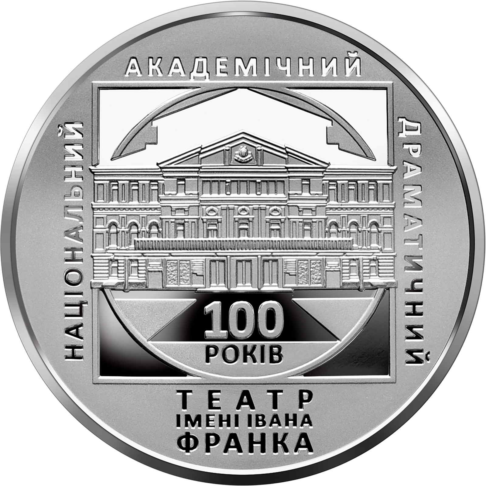 Опис: Є стилізована композиція, що нагадує логотип театру: у квадратній рамці на гладкому тлі зображено рельєфне зображення театру; на матовому тлі розміщено такі написи: 100/РОКІВ (100/років) (під будівлею); НАЦІОНАЛЬНИЙ (національний) (вертикально, ліворуч); АКАДЕМІЧНИЙ (академічний) (зверху); ДРАМАТИЧНИЙ (драматичний) (вертикально, праворуч); ТЕАТР/ІМЕНІ ІВАНА/ФРАНКА (театр імені Івана Франка) (знизу).