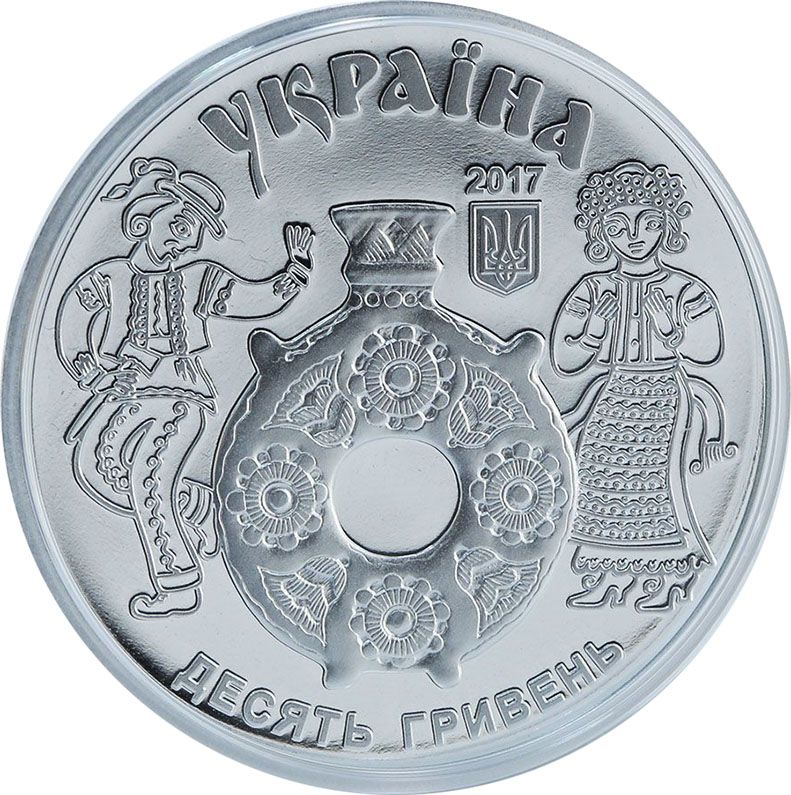 Опис: Зверху розміщено напис «УКРАЇНА», під яким праворуч вказано рік випуску монети 2017 та малий герб України; далі йде стилізована композиція: на гладкому тлі в центрі зображено керамічний посуд, розписаний у косівському стилі, по обидва боки якого стоять хлопчик і дівчинка в національному вбранні (елементи, що використовуються в косівському стилі живопису); нижче вказано номінал монети (напівкруглий): ДЕСЯТЬ ГРИВЕНЬ (10 гривень).