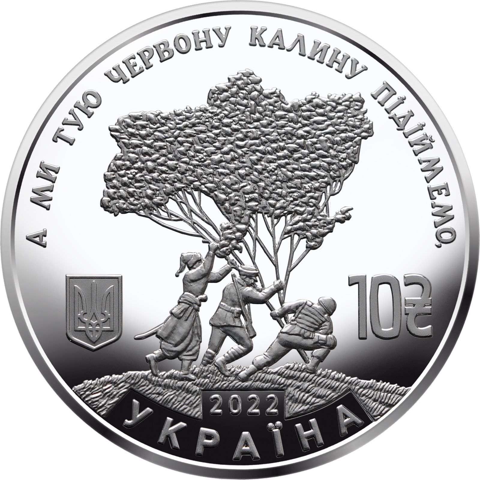 Опис: На дзеркальному тлі зображено невеликий державний герб України (зліва), у центрі — стилізована символічна композиція: захисники різних поколінь — козак, січовий стрілець і сучасний солдат Збройних сил України — піднімають калину — поетичний символ України, віночок якої нагадує контури кордонів нашої Батьківщини; написи: МИ ПІДНІМЕМО ТУ ЧЕРВОНУ ГУЛЬДЕР-РОЗУ, (зверху півколом), внизу – рік карбування – 2022 і півколом – УКРАЇНА, праворуч – номінал – 10 і розміщений графічний символ гривні; внизу праворуч (під номіналом) – логотип Банкнотно-монетного двору Національного банку України.