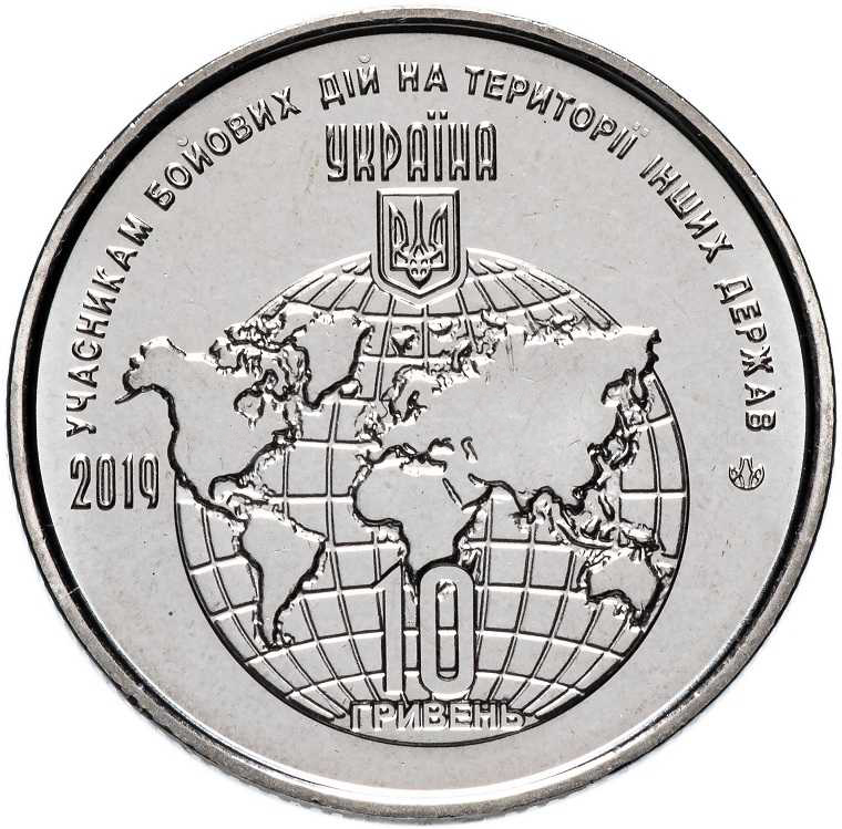 Опис: На монеті зображено малий герб України, над яким розміщено напис «УКРАЇНА»; на гладкому тлі зображено таку стилізовану композицію: на тлі земної кулі зображено континенти та номінал монети 10/ГРИВЕНЬ (10/гривень) (внизу); зліва – рік випуску монети 2019; праворуч – знак монетного двору ДП «Банкнотно-монетний двір НБУ»; зверху – напівкруглий напис: УЧАСНИКАМ БОЙОВИХ ДІЙ НА ТЕРИТОРІЇ ІНШИХ ДЕРЖАВ (українські миротворчі війська).