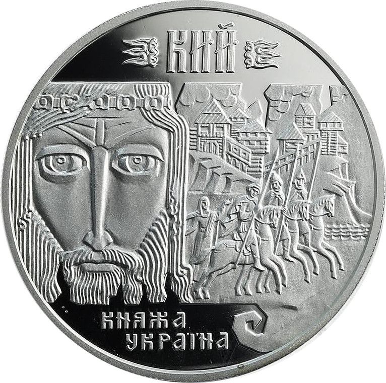 Опис: На тлі рулону зображено композицію з трьох частин, що складається з зображення князя Кия, фігур трьох братів-вершників і жінки (Кия, Щека, Хорива та їхньої сестри Либіді) і фортеці на пагорбі. На монеті є умовний напис: КИЙ (Кий (зверху) і КНЯЖА УКРАЇНА (Князі України) (знизу у два рядки).