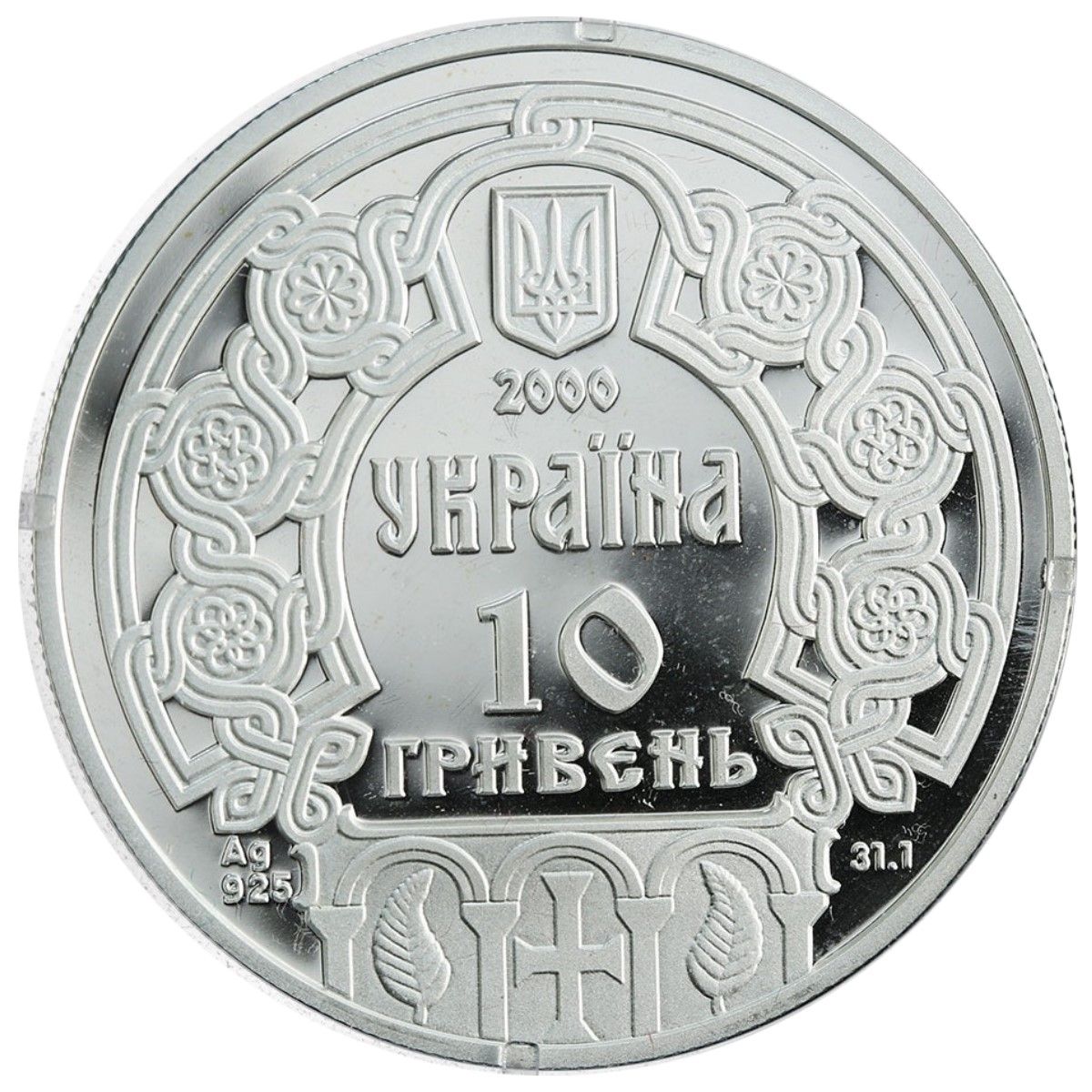 Опис: У рамках староруського орнаменту саркофага княгині Ольги з церкви Троїці зображено малий Державний герб України та написи: 2000 / УКРАЇНА / 10 / ГРИВЕНЬ, а також позначення металу, його проби та ваги монети в пробі.