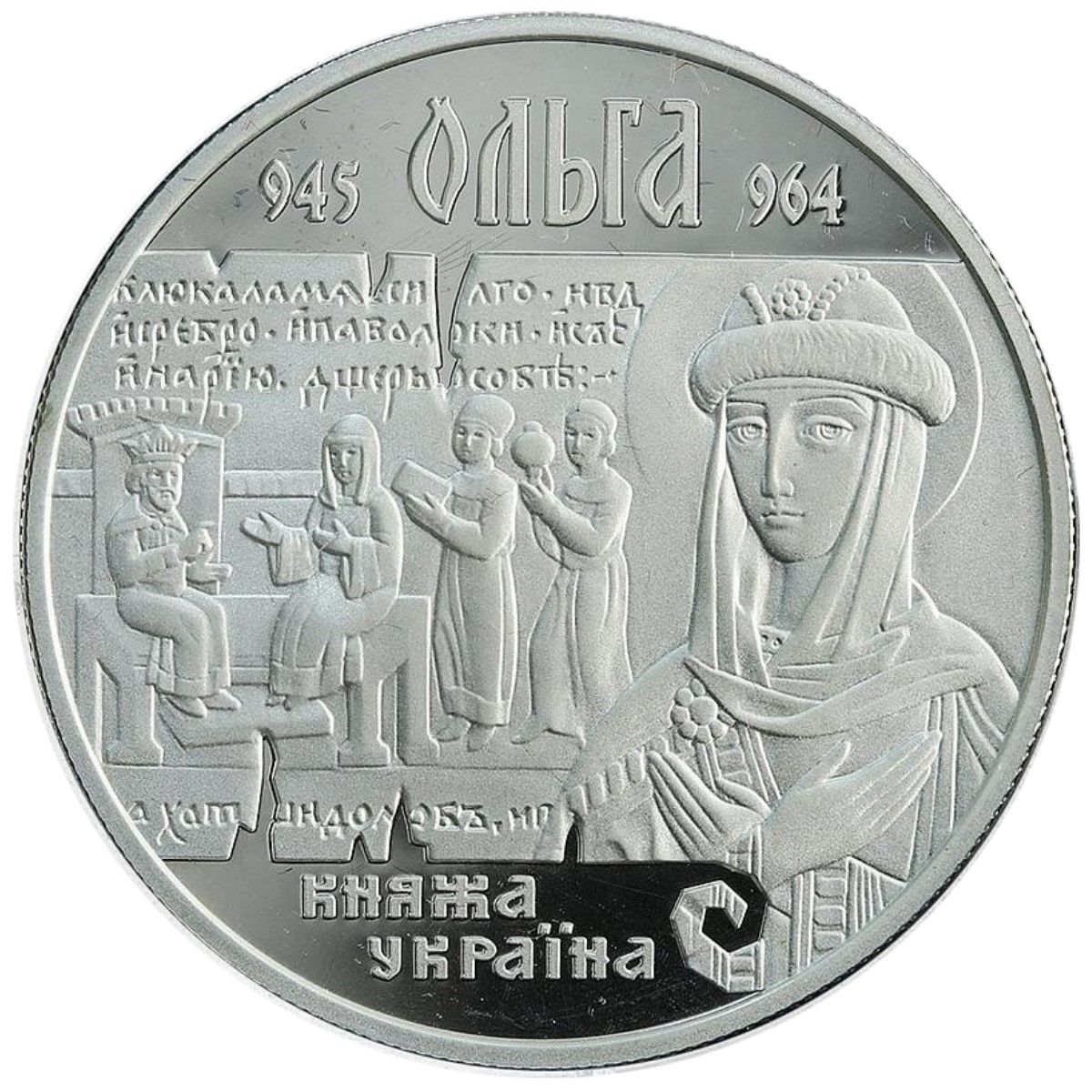 Опис: На тлі історичної сцени, що зображує прийом княгині Ольги імператором Костянтином, розміщено урочистий портрет княгині Ольги та стилізовані написи: ОЛЬГА та 945-964 (945, Ольга, 964) — зверху, та КНЯЖА / УКРАЇНА (Князі України) — знизу.