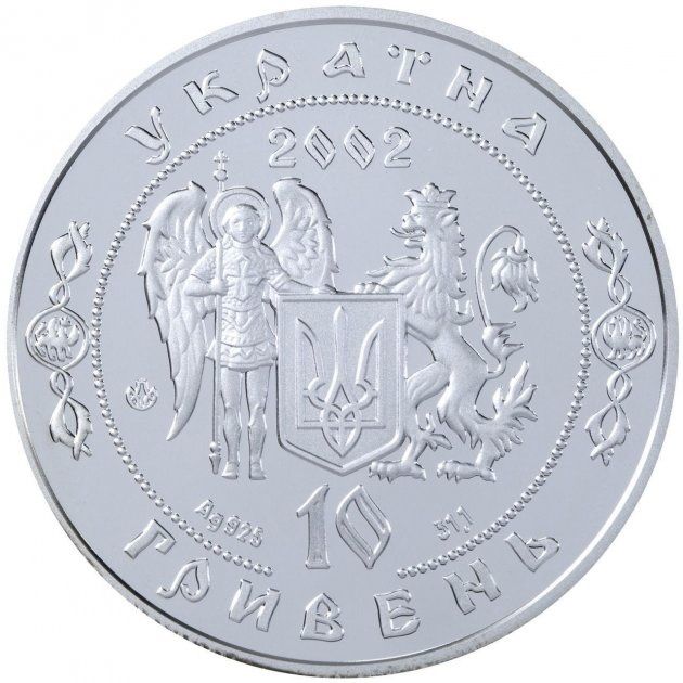 Опис: Є композиція, схожа на всю серію монет, яка втілює національну ідею єдиної України: поруч із маленьким Державним гербом України розташовані символічні фігури Михаїла Архістратега та коронованого лева, які є символами міст Києва та Львова. Кругові написи розділені бароковим орнаментом: УКРАЇНА, 10 ГРИВЕНЬ, 2002, позначення дорогоцінного металу - Ag 925 та його вага в пробі - 31,1.