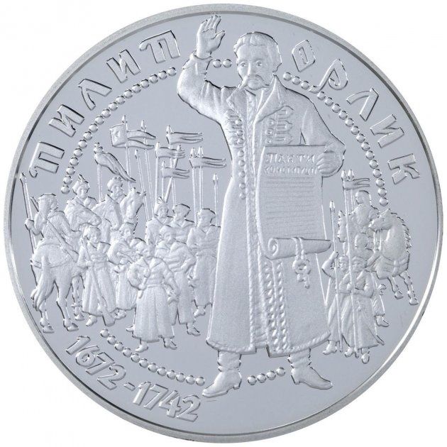 Опис: У колі, утвореному ниткою з намистин, зображений Пилип Орлик в оточенні своїх козацьких побратимів, з піднятою правою рукою і розгорнутим сувоєм конституції в лівій руці. Між зовнішнім краєм монети та півколом з намистин розміщено умовний напис: ПИЛИП ОРЛИК (Пилип Орлик) та роки його життя: 1672 - 1742 - нижче ліворуч.