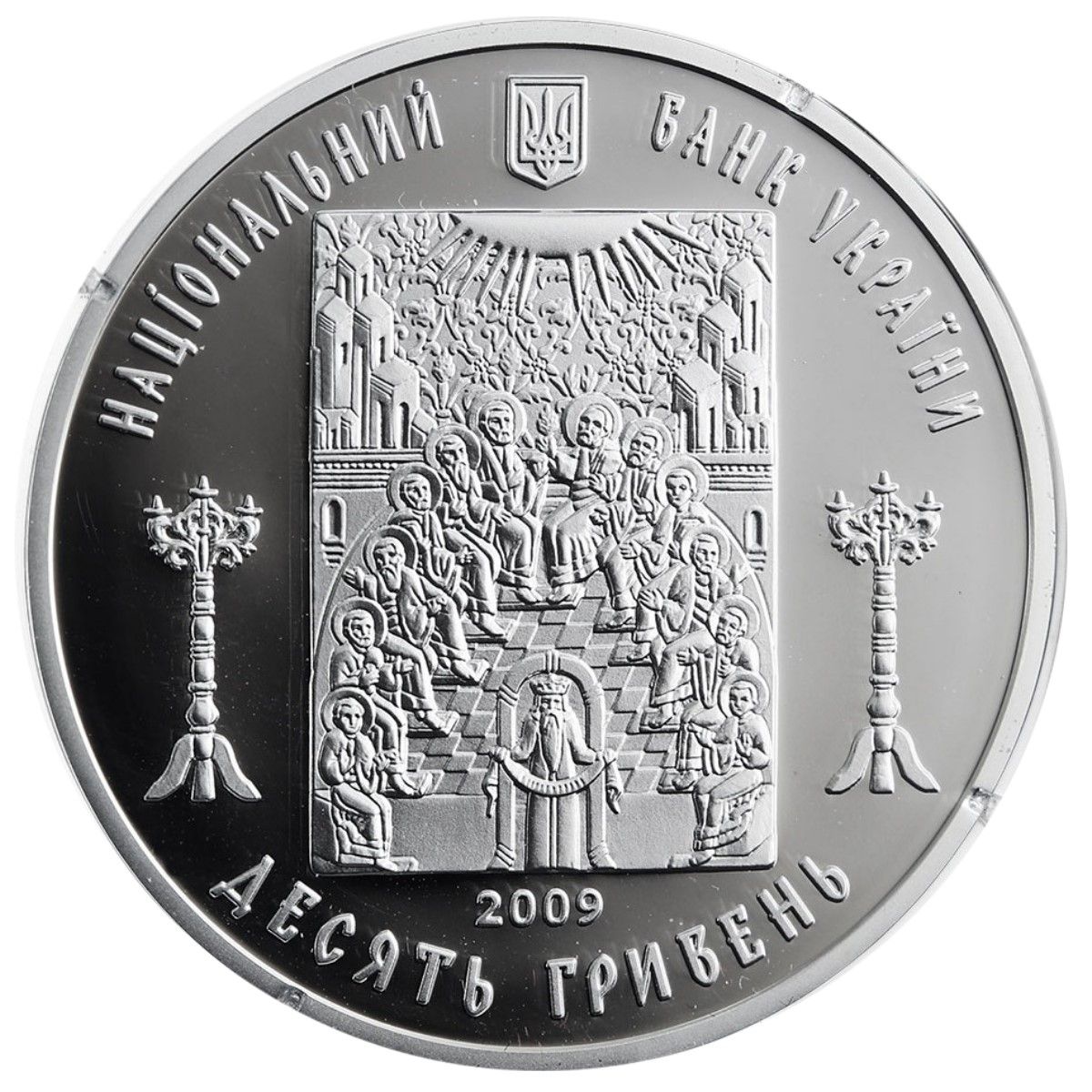 Опис: На монеті зображено малий герб України та напівкруглий напис: НАЦІОНАЛЬНИЙ БАНК УКРАЇНИ (Національний банк України); стилізоване зображення ікони XVI століття «Зішестя Святого Духа на апостолів» з канделябрами праворуч і ліворуч від неї; нижче — рік випуску монети 2009 та номінал 10 ГРИВЕНЬ (10 гривень).