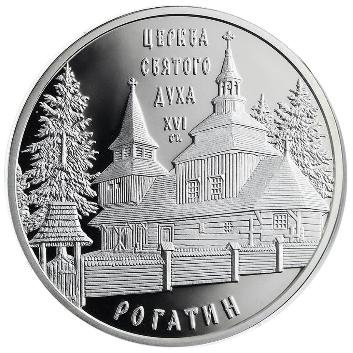 Опис: На монеті зображено церкву з написами: ЦЕРКВА/СВЯТОГО/ДУХА/XVI/СТ. (Церква/Святого/Духа/XVI/століття) зверху та РОГАТИН (Рогатин) знизу, вигнуті.