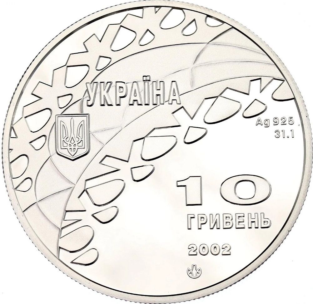 Опис: На монеті зображено напівкругле стилізоване зображення фрагмента сніжинки, на якому розміщено написи «УКРАЇНА» та малий Державний герб України; нижче та праворуч на дзеркальному тлі розміщено написи: 10 / ГРИВЕНЬ / 2002, а також позначення металу, його проби та ваги в пробі.
