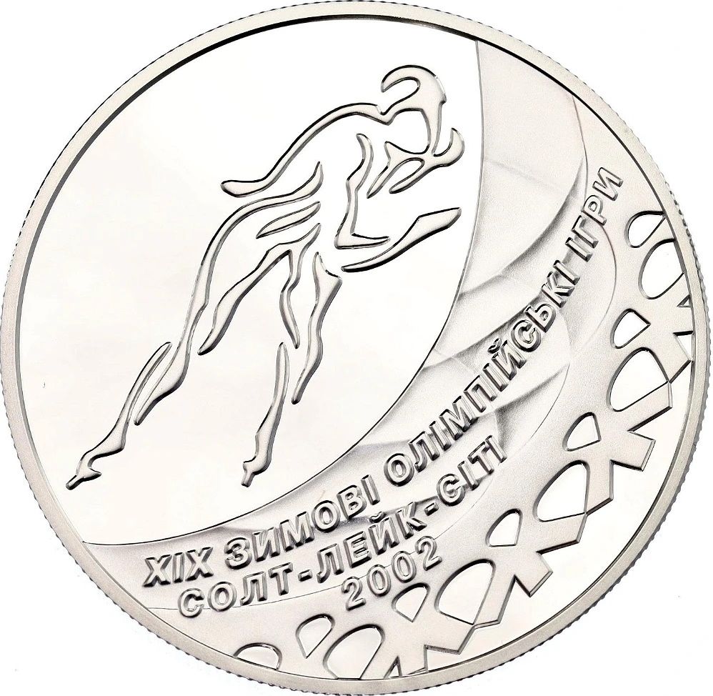 Опис: Вгорі та ліворуч на дзеркальному тлі зображено стилізоване зображення ковзаняра; внизу та праворуч вигравірувано сніжинку, на тлі якої розміщено трирядкові написи: ХІХ ЗИМОВІ ОЛІМПІЙСЬКІ ІГРИ / СОЛТ-ЛЕЙК-СІТІ / 2002 (19-ті Зимові Олімпійські ігри / Солт-Лейк-Сіті / 2002).