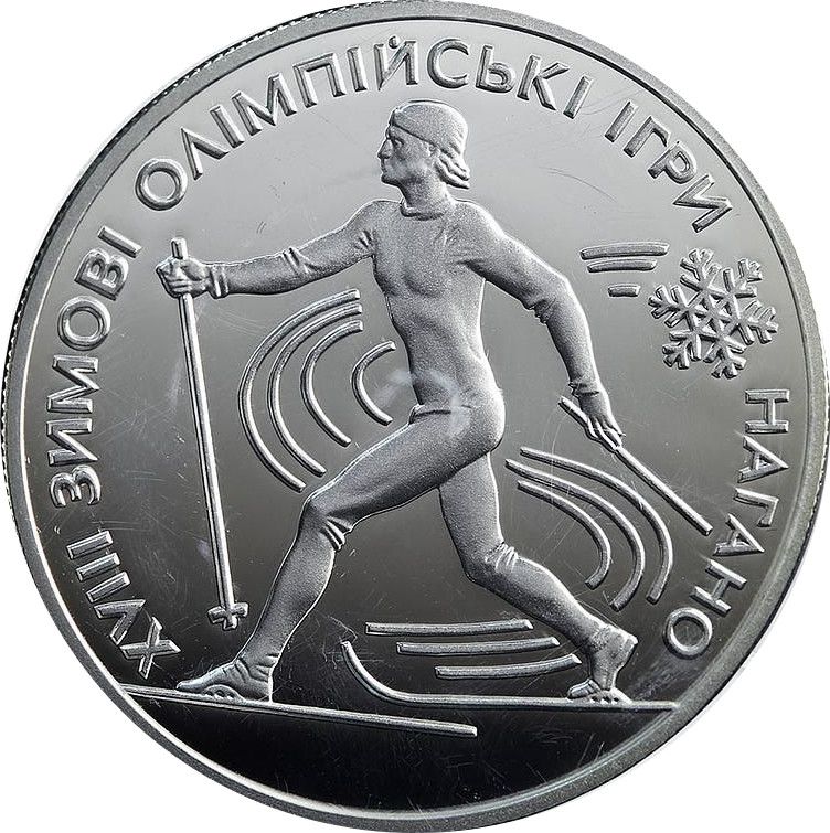 Опис: На монеті зображено лижника на тлі декоративних слідів. По колу розміщено напис: ХVІІІ ЗИМОВІ ОЛІМПІЙСЬКІ ІГРИ НАГАНО, розділений сніжинками.