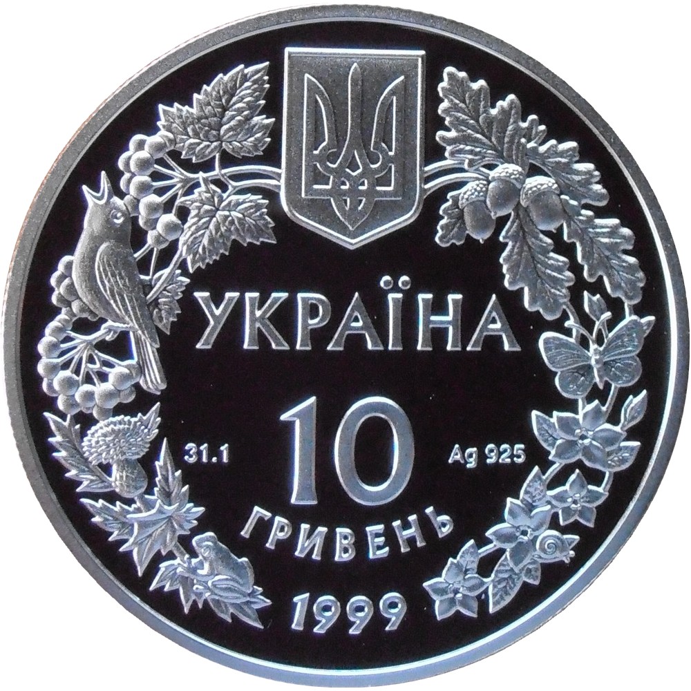 Опис: У вінку з зображеннями вибраних видів флори і фауни вигравірувано невеликий Державний герб України та чотирирядкові написи: на срібній монеті: УКРАЇНА, 10, ГРИВЕНЬ, 1999 (Україна/ 10 /гривня/1999), а також позначення металу — Ag 925, його проба — 31,1, вага монети в пробі.