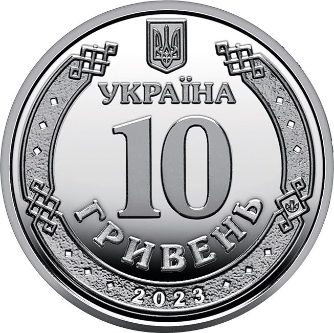 Опис: Зверху зображено малий герб України; у центрі, оточений старовинним руським орнаментом, розміщено напівкруглий напис: УКРАЇНА/10/ ГРИВЕНЬ (Україна/10/гривень); на тлі орнаменту вказано рік випуску монет – 2023 (знизу) та знак монетного двору НБУ (праворуч).