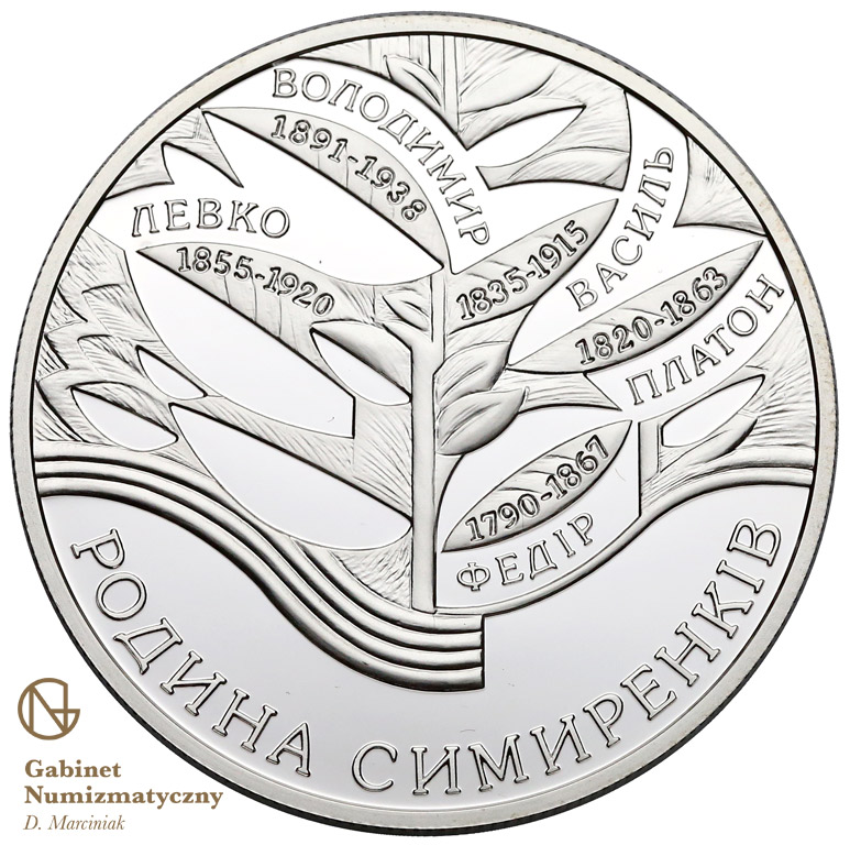 Опис: На монеті зображено стилізоване генеалогічне дерево, серед листя та гілок якого вказані імена та роки життя членів родини Симиренко: ФЕДІР (1790–1867), ПЛАТОН (1820–1863), ВАСИЛЬ (1835–1915), ЛЕВКО (1855 - 1920), ВОЛОДИМИ (1891 - 1938), а нижче - напівкруглий напис: РОДИНА СИМИРЕНКІВ.