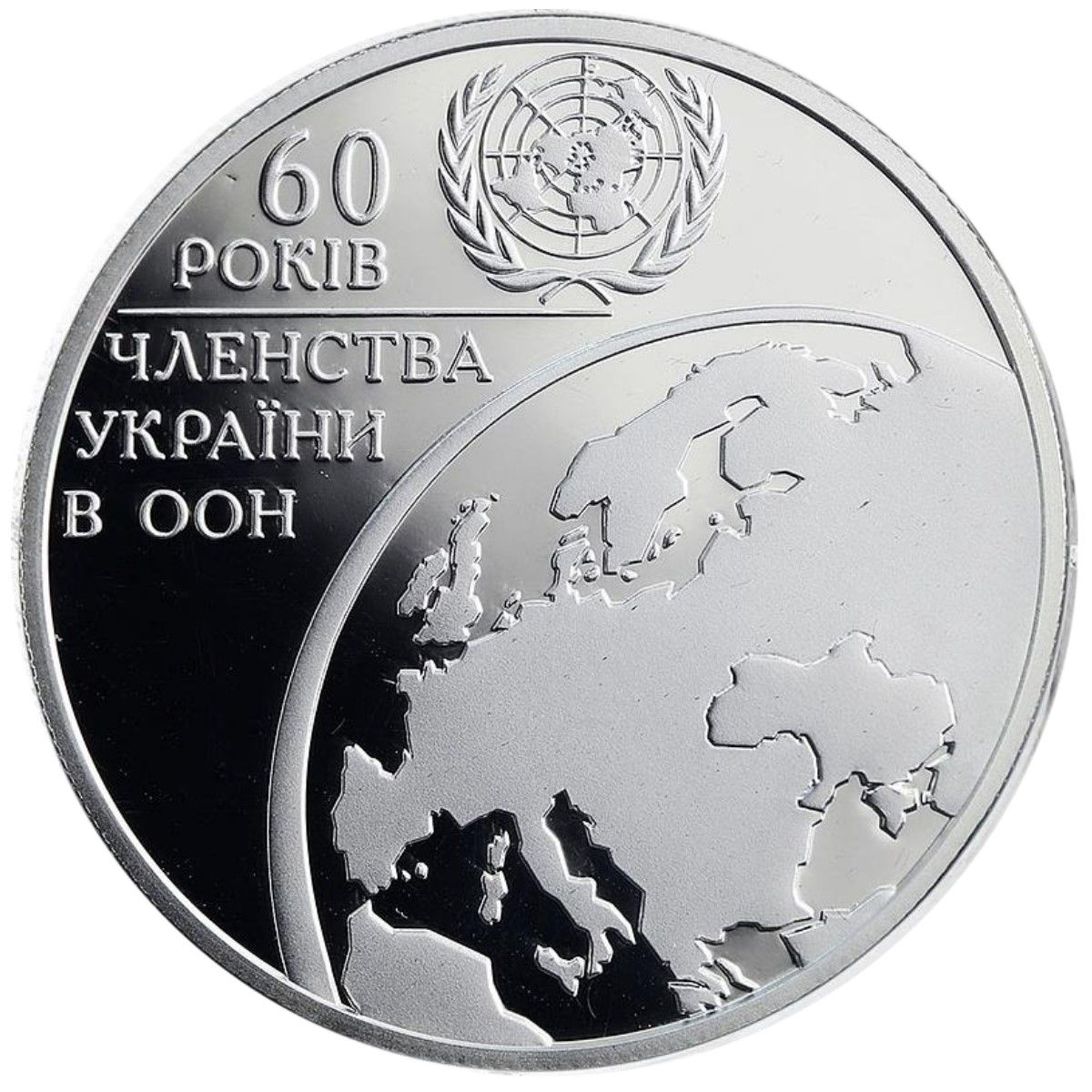 Опис: Праворуч на рельєфному тлі зображено оливкову гілку, яка прикрашає емблему ООН (символ миру); на скляному тлі зображено невелику Державну емблему України, ліворуч — написи: УКРАЇНА/ 10/ ГРИВЕНЬ/ 2005 (Україна/ 10 / гривня/ 2005), Аg 925, позначення металу та 31,1, вага монети в пробі, а також логотип Монетного двору Національного банку України.