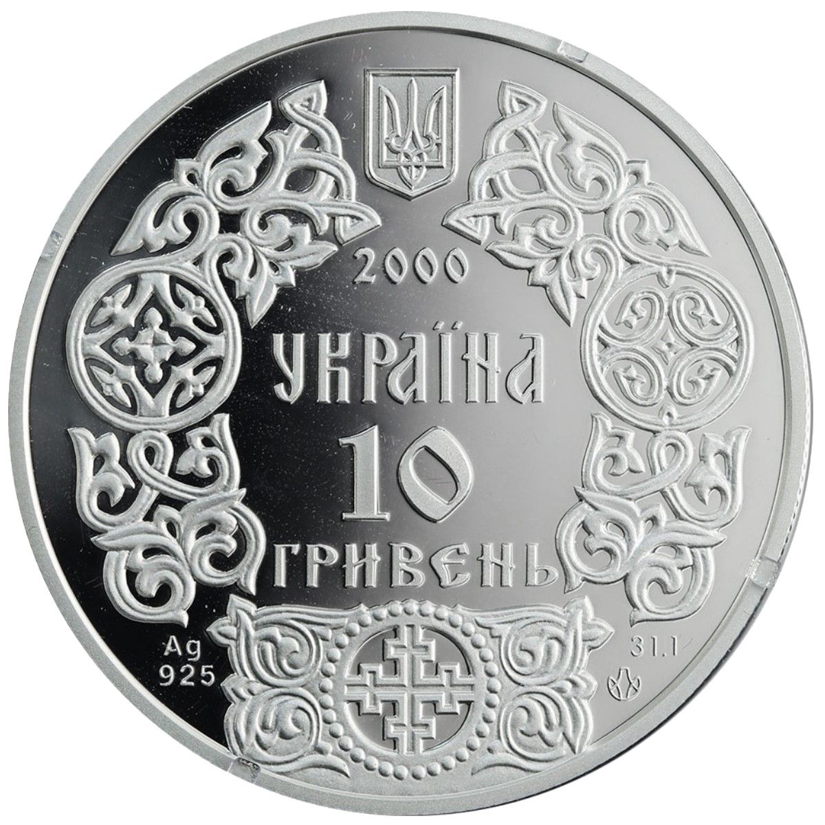 Опис: У рамках староруського орнаментального візерунка зображено невеликий Державний герб України та стилізований напис: 2000 / УКРАЇНА / 10 / ГРИВЕНЬ, а також вказівка на метал, його пробу — Ag 925, вагу монети в пробі 31,1 та логотип Монетного двору Національного банку України.