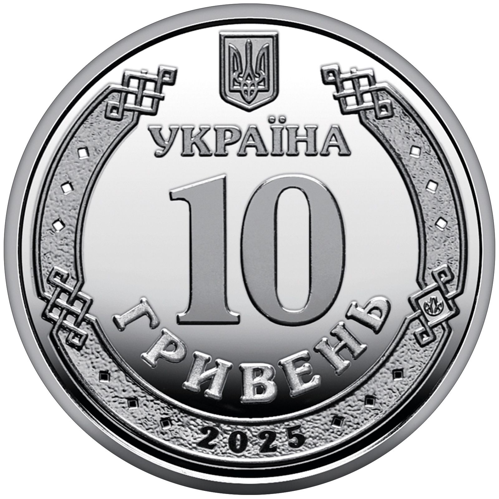 Опис: Зверху зображено малий герб України; у центрі, оточений старовинним руським орнаментом, розміщено напівкруглий напис: УКРАЇНА/10/ ГРИВЕНЬ (Україна/10/гривень); на тлі орнаменту вказано рік випуску монет – 2025 (знизу) та знак монетного двору ДП «Держдрукарня» НБУ (праворуч).