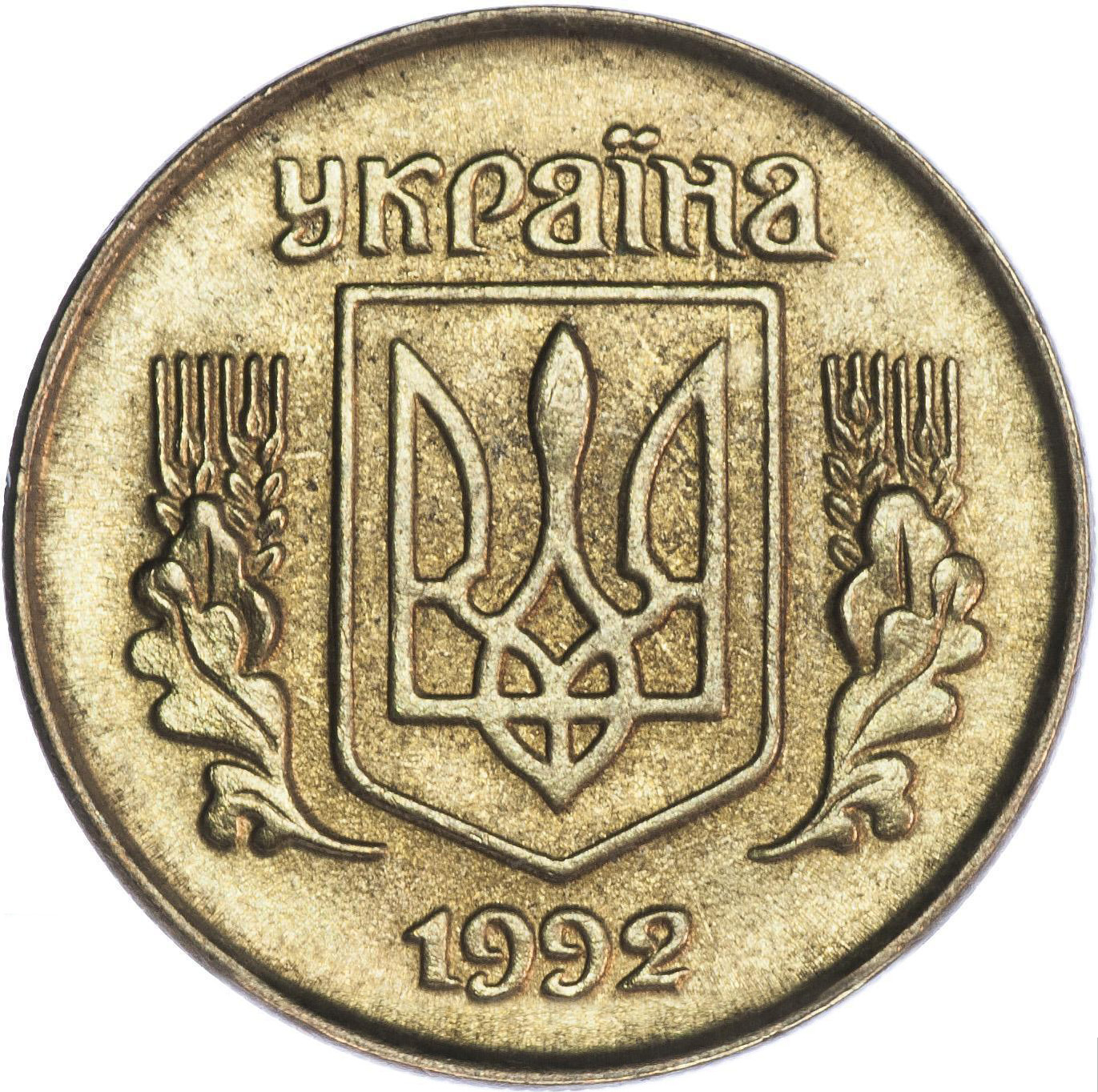 Опис: Державний герб України — тризуб. Щит України, рослини по боках, дубовий лист спереду. Два колоски пшениці позаду. Назва країни вгорі. Рік випуску внизу.