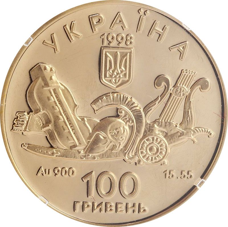 Опис: На монеті зображено малий герб України, оточений античними та козацькими атрибутами: двома лірами, шоломом, шаблею, флягою та колчаном зі стрілами. На монеті є такі написи: УКРАЇНА та 1998 (зверху); 100 ГРИВЕНЬ, Au 900, позначення дорогоцінного металу та 15,55, його чиста вага (знизу, у два рядки).