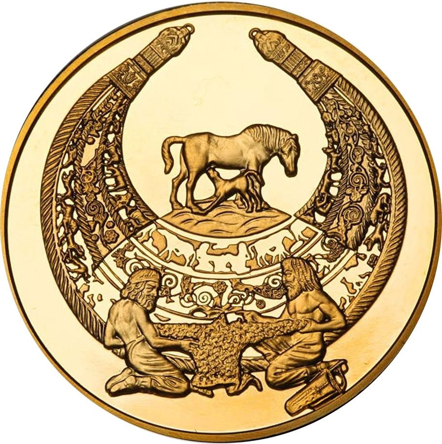 Опис: На тлі скіфського кургану зображено нагрудник із збільшеними фрагментами верхнього ярусу. Над нагрудником зображено кобилу з лошам, під ним — двох чоловіків, які розтягують шкуру тварини.