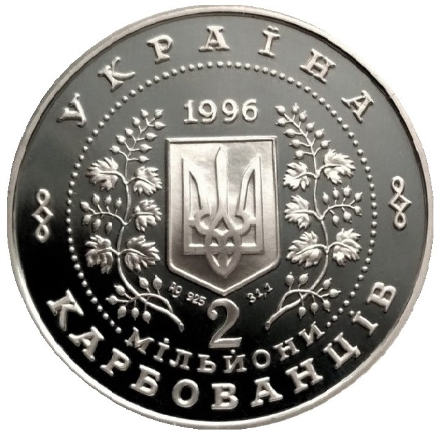 Опис: У центрі орнаменту з намистин, обрамленого гілками калини, розміщено невеликий Державний герб України. Над Державним гербом вказано рік випуску — 1996. По колу монети розміщені написи: УКРАЇНА — зверху та трирядковий напис 2 МІЛЬЙОНИ КАРБОВАНЦІВ — знизу. Під гербом держави розміщені позначення Аg 925 та 31,1 — чиста вага монети.