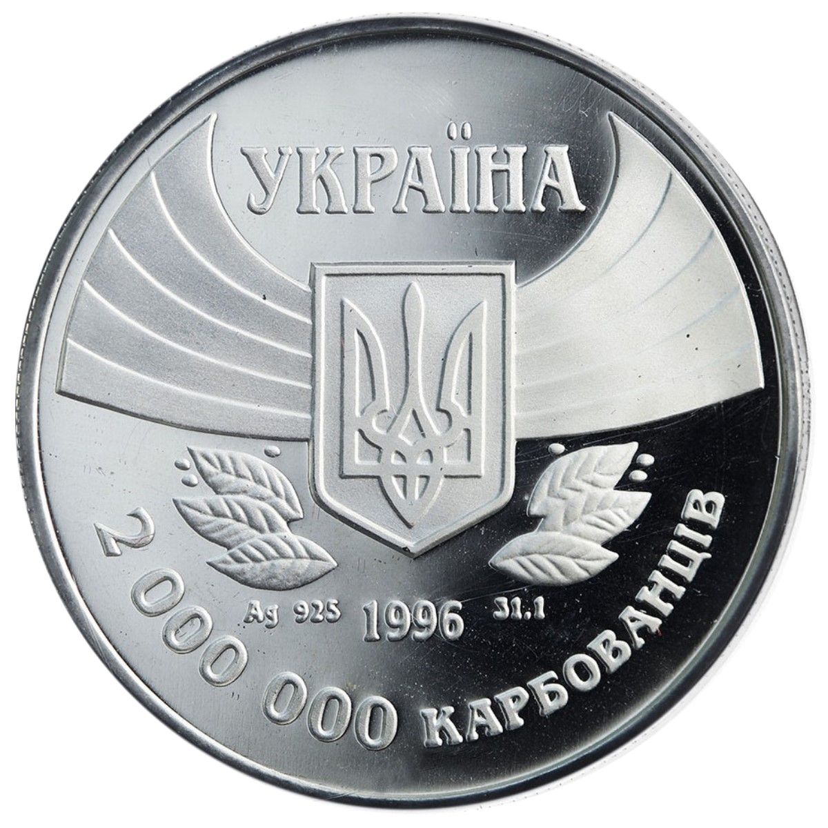 Опис: У центрі монети зображено малий герб України. По обидва боки від нього — стилізовані зображення лаврових гілок та листя. Зверху розміщено напис «УКРАЇНА», знизу — 1996, рік випуску. Знизу, по колу монети, розміщено напис: 2 000 000 КАРБОВАНЦІВ. На обох сторонах монети від дати випуску розміщено позначення Аg 925 та 31,1, чиста вага монети.