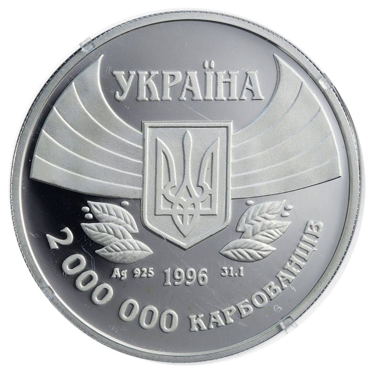 Опис: У центрі монети зображено малий герб України. По обидва боки від нього — стилізовані зображення лаврових гілок та листя. Зверху розміщено напис «УКРАЇНА», знизу — 1996, рік випуску. Знизу, по колу монети, розміщено напис: 2000000 КАРБОВАНЦІВ. По обидва боки від дати випуску розміщено позначення Аg 925 та 31,1, чиста вага монети.